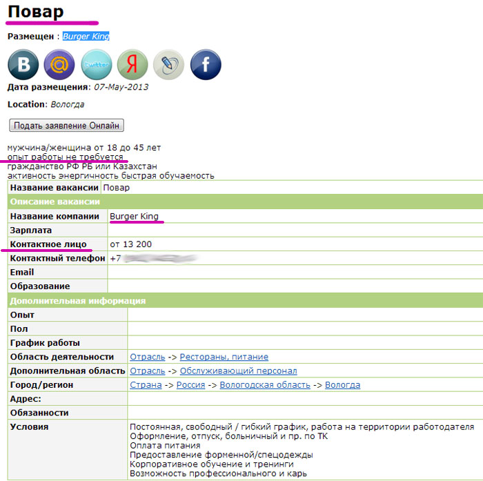 Сразу же бросается в глаза с каким старанием (и как следствие будущим уважением к работнику) было заполнено данное объявление. Наши предприниматели поступают гораздо проще, тыц и все понятно). В общем не упустите свой шанс стать поваром в престижной компании!